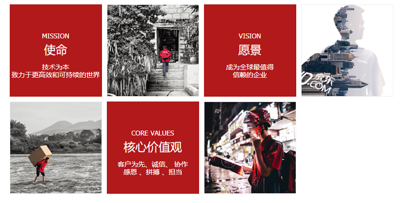 京東集團奉行客戶為先、誠(chéng)信、協作、感恩、拚搏、擔當的價(jià)值觀,以“技術為本,致力於更(gèng)高效和可持續的世界”為使命,目標是(shì)成為全球最值得信賴的企業。